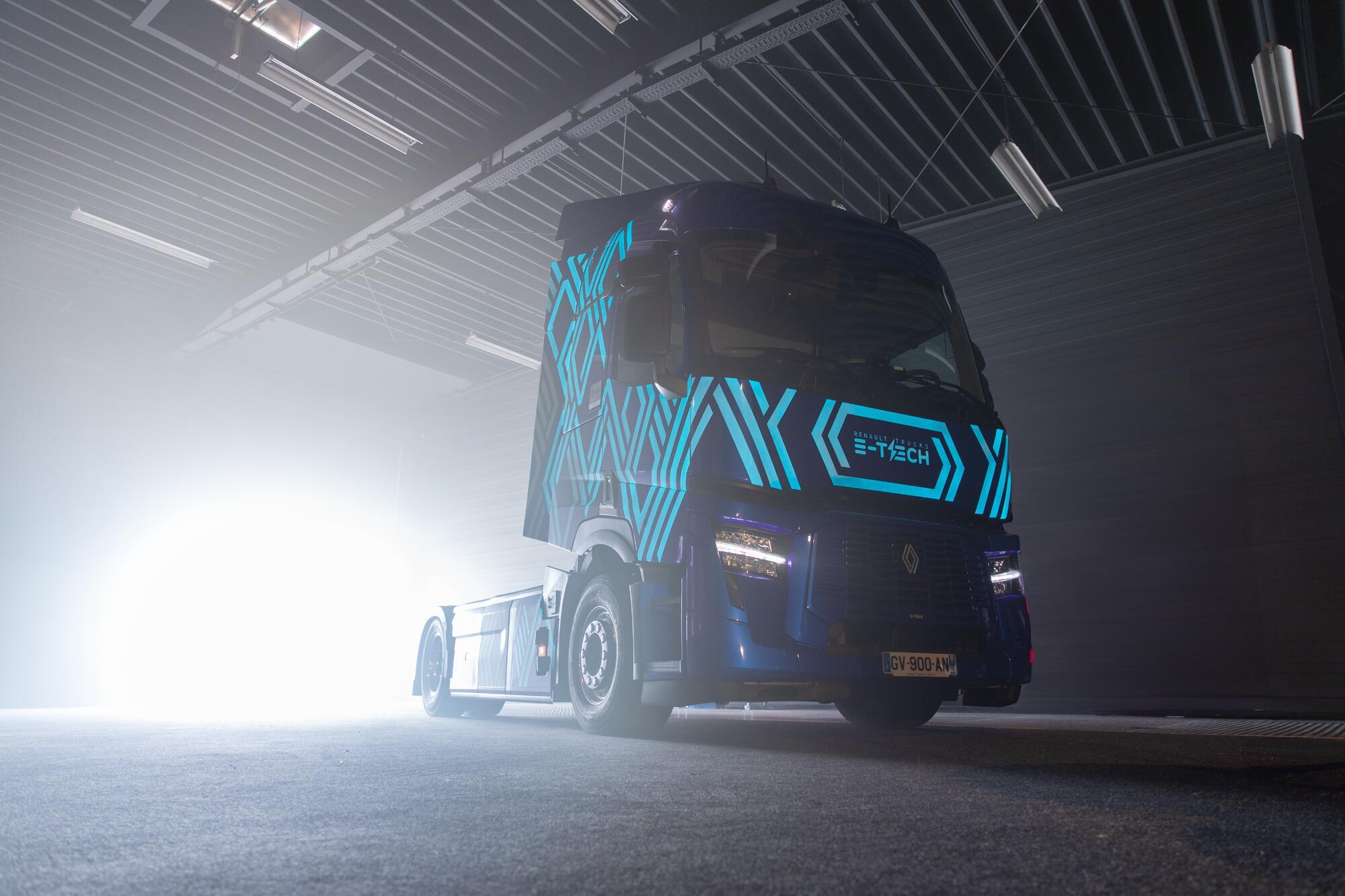 Designed for regional distribution of food, beverages, commerce, and logistics, this Renault Trucks E-Tech T features electroluminescent paint using Lumilor technology. The bodywork lights up in the dark when subjected to an electrical stimulus.