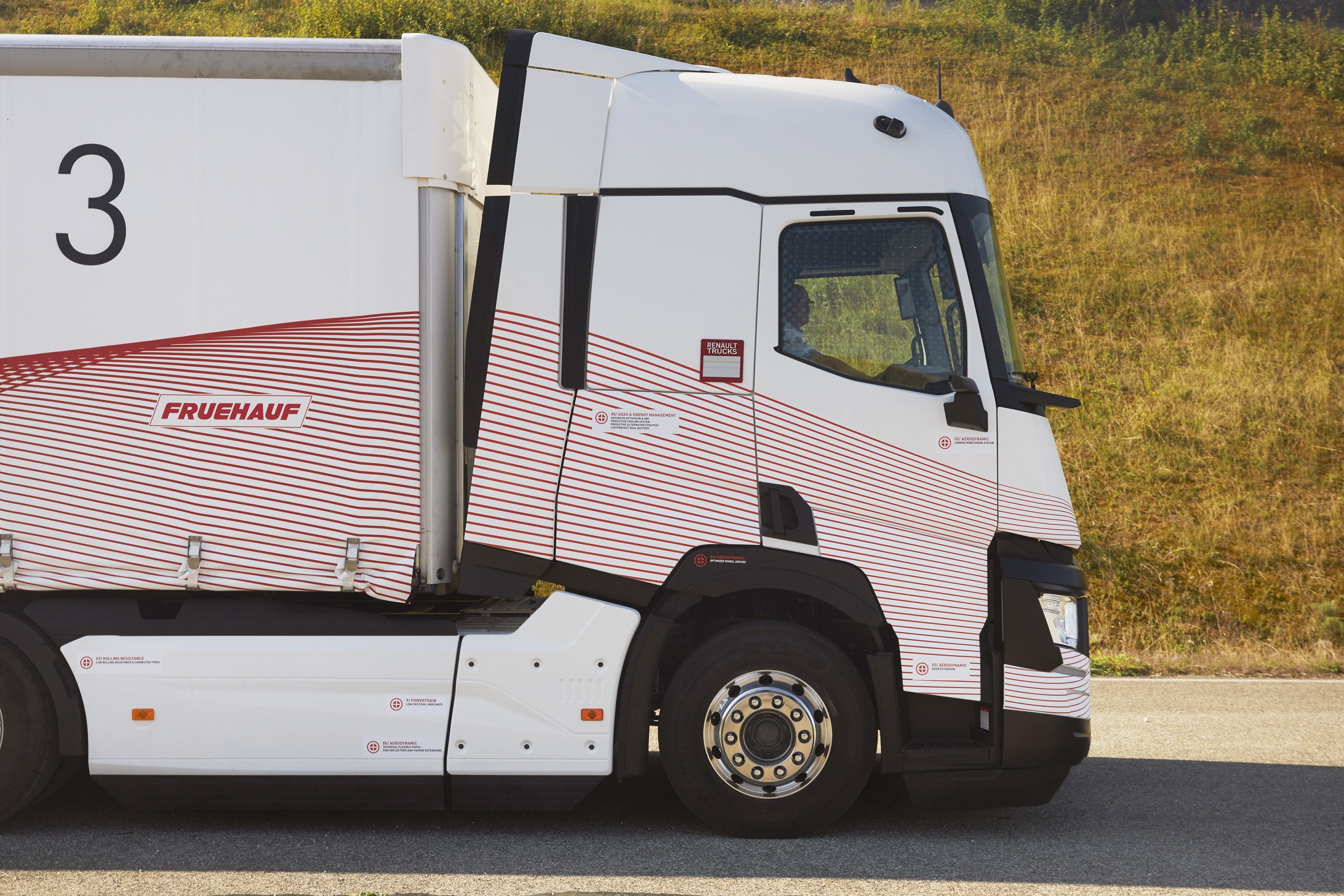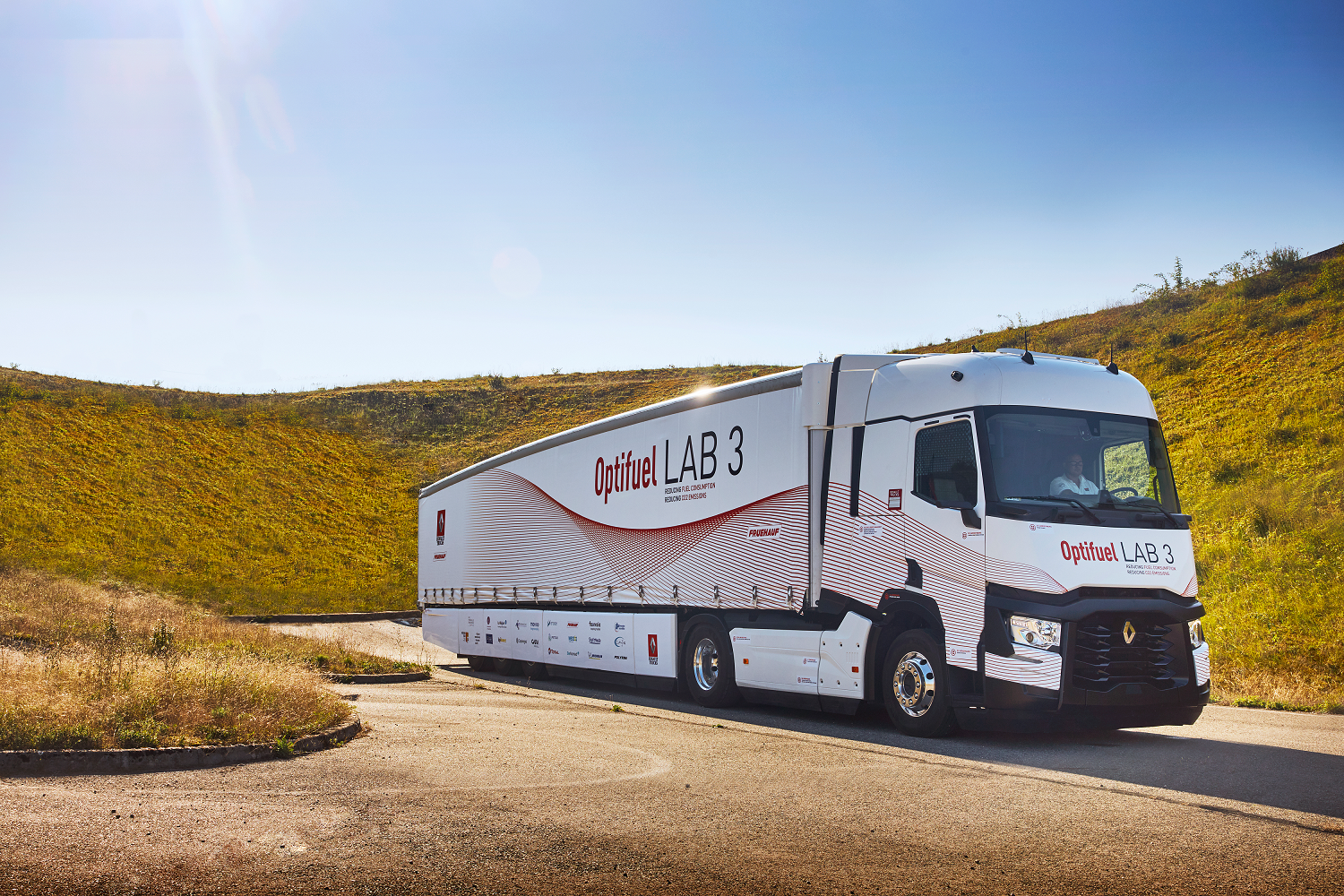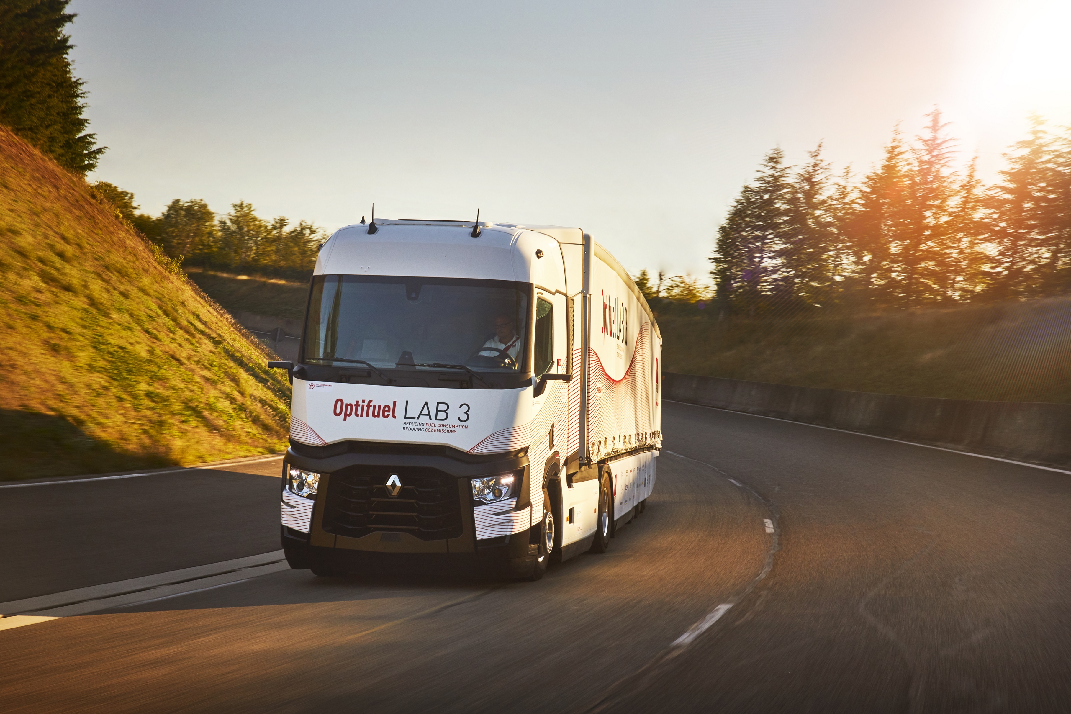 This project produced the Optifuel Lab 3 laboratory vehicle. After 18 months of development, 6 months of tests on tracks and open roads and 15,500 kilometres, Renault Trucks has been able to confirm its assumptions. The manufacturer has measured a 12.5% reduction in fuel consumption compared with the Renault Trucks T series coupled to a standard trailer. This represents a saving of 3.75 litres of fuel and 9.8 kg of CO2 per 100 km.
