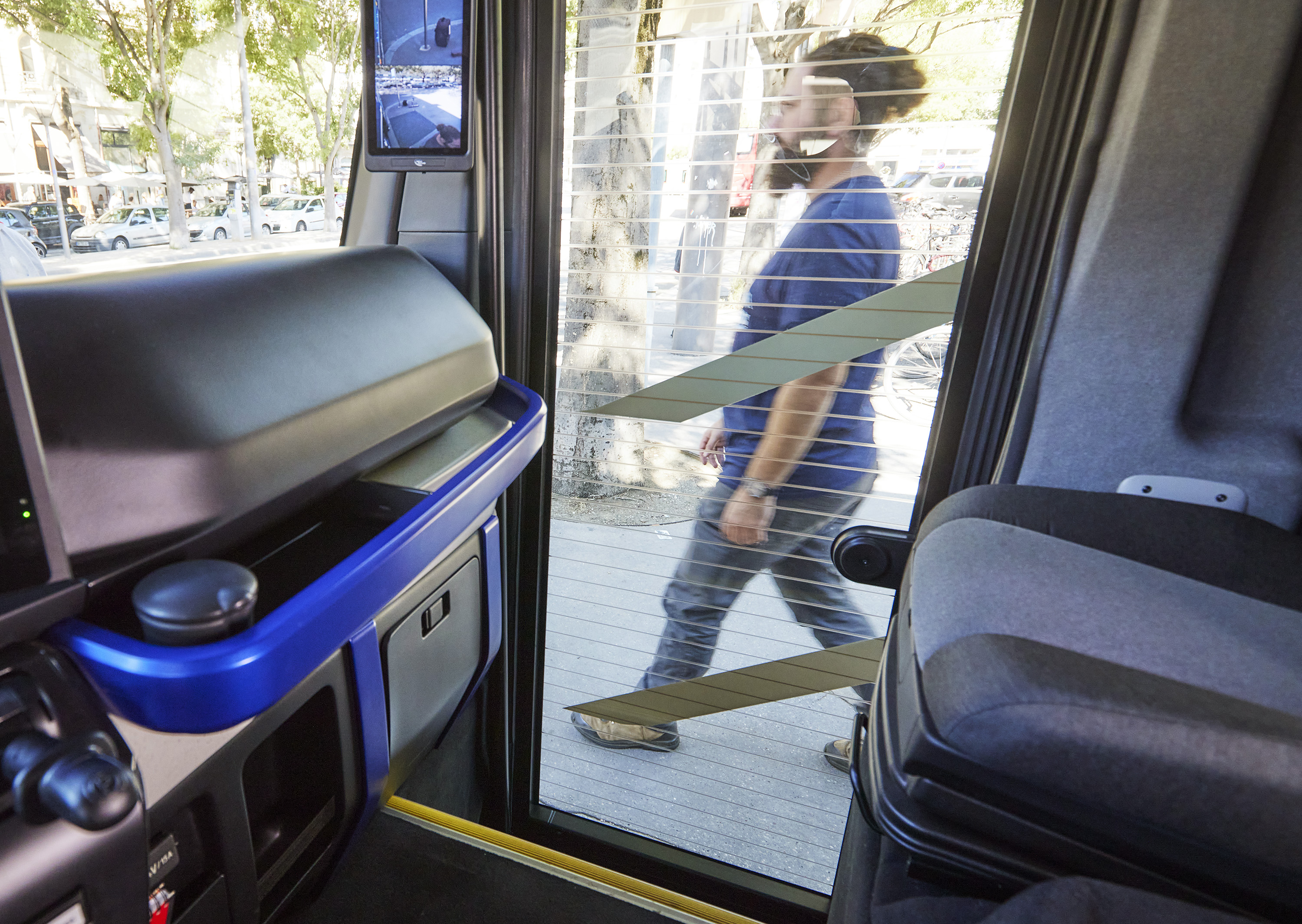 This vehicle -project name: Oxygen- makes it possible to integrate all the requirements and functions of city-center delivery: elimination of nuisances such as pollution and noise, and improvement of active and passive safety in order to better manage co-existence with all road users. The truck has a lowered cab, giving the driver an excellent direct view. A large windscreen and multiple cameras instead of mirrors provide a 360° view. On the passenger side, a sliding side door avoids the risks associated with opening a conventional door. The driver is able to get out of the truck on either side, left or right. Climbing in and out of the truck is made easier by a much lower access height than on a standard delivery truck.